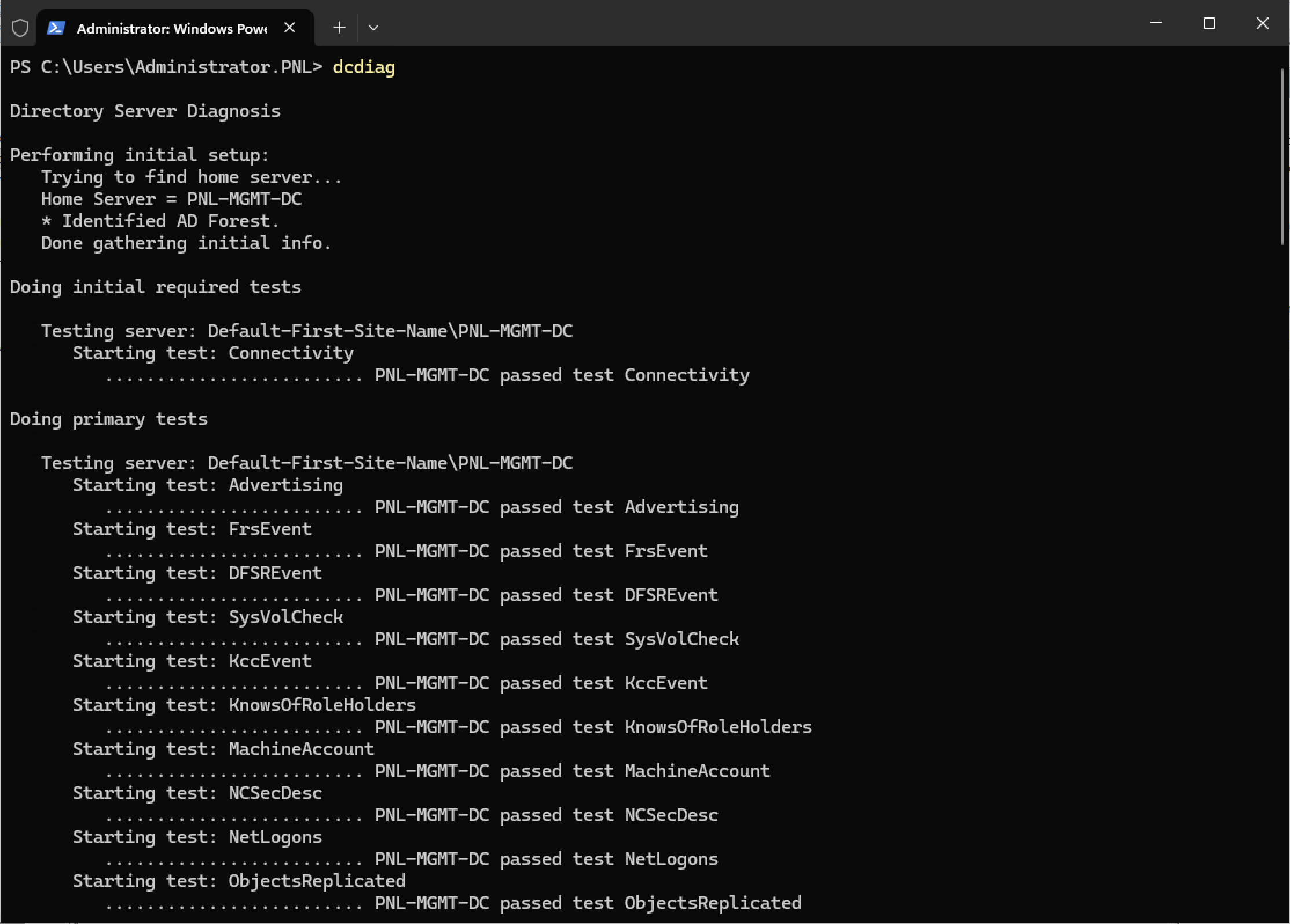 DCDIAG: The next most important check is the general health of the domain controller itself. To check this, use dcdiag, (or dcdiag /v for a more detailed response).