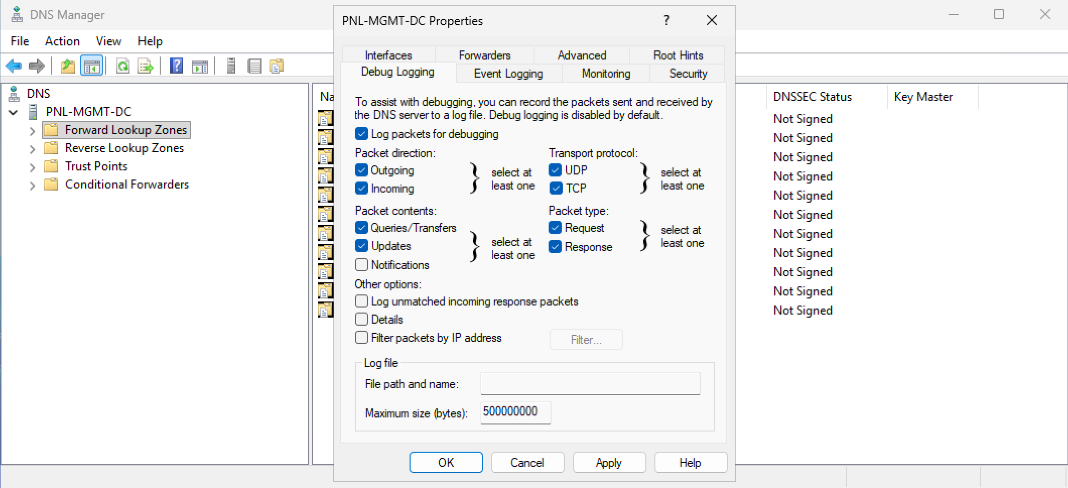Audit DNS: Open DNS Manager. > Right-click the server name > Properties > Go to the Debug Logging tab > Enable Log packets for debugging and select: